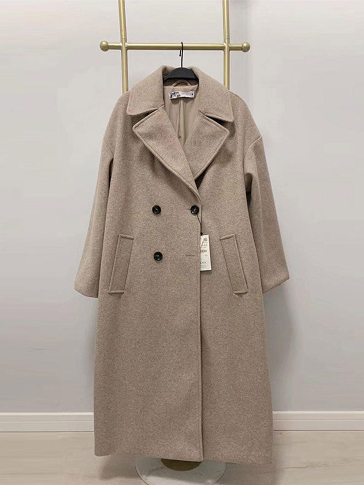 Women Elegant Double Breasted Woolen Coat 2023 Spring Fashion Chic Lapel Overcoat Office Ladies Solid Cashmere Long Outerwear