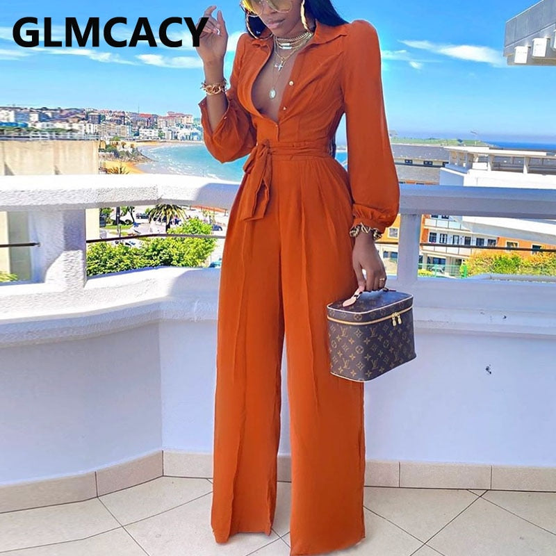 Women Long Sleeve Turn Down Collar Jumpsuits Chic Solid Regular Button Detail Shirt Jumpsuits