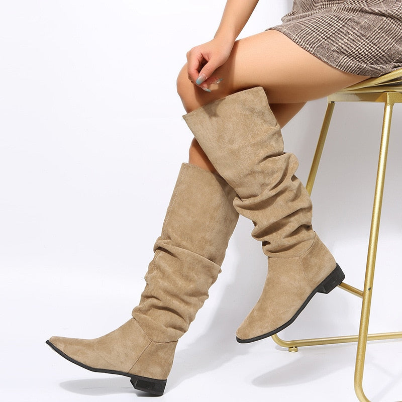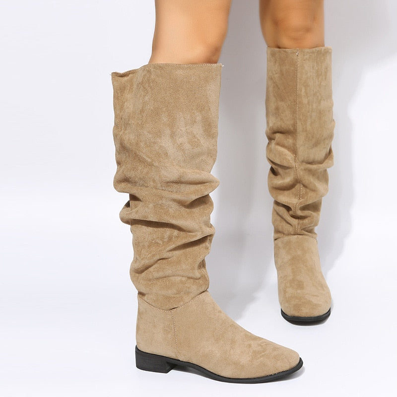 New High Quality Pleated Boots Women Black Nude Faux Suede Flock Knee High Boots Ladies Flat Autumn Winter Dress Shoe