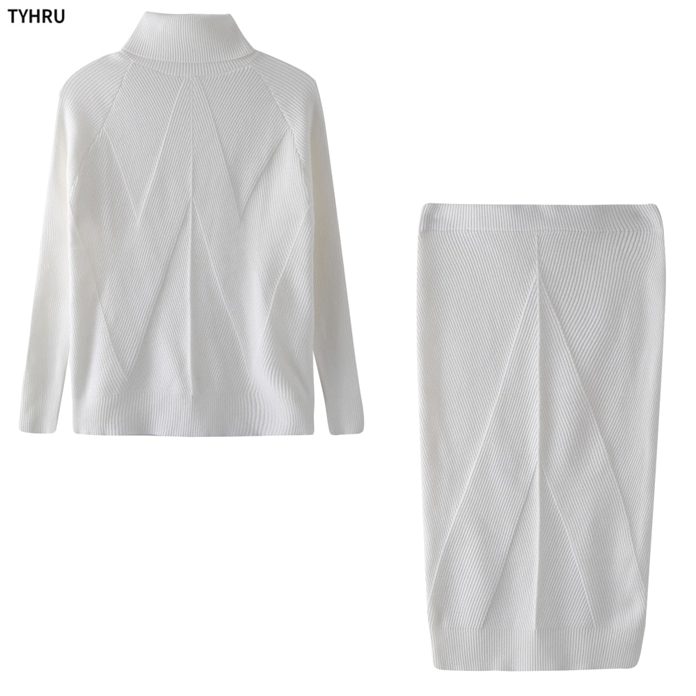 TYHUR Autumn Women's Knitting Costume Turtleneck Solid Color Pullover Sweater + Slim Skirt Two-Piece Set