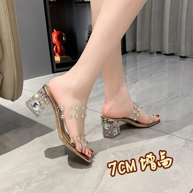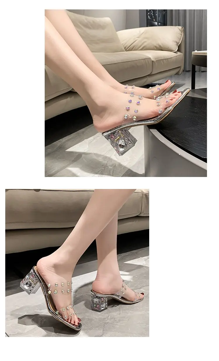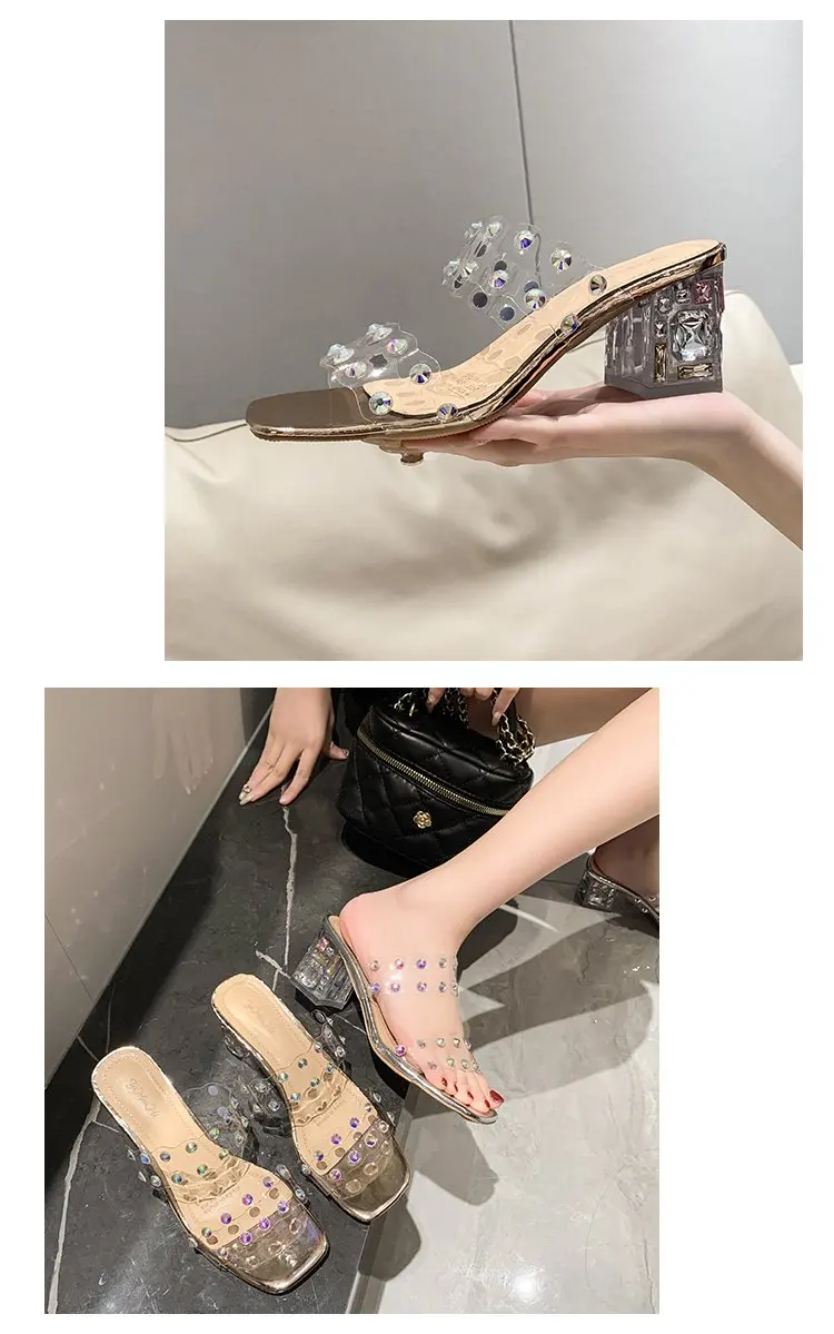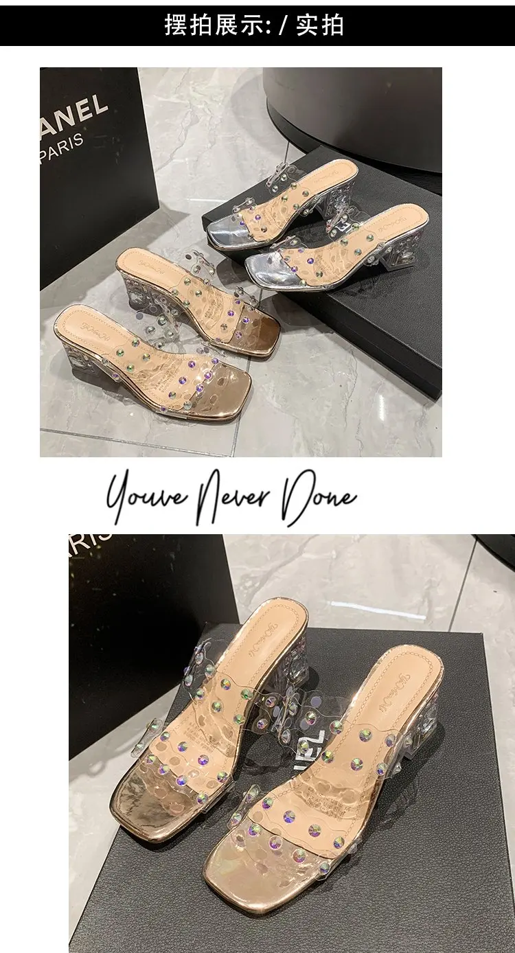 Women's Sequin Sheer Sandals Slippers Women's Fashion Square Heel High Heels Sliding Thick Mule Wedding Shoes Women Shoes
